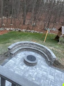 This expansive backyard upgrade features a sleek paver patio with a modern gray palette, a built-in fire pit, and a curved stone seating wall. Designed for comfort and durability, the space blends elegance with functionality—ideal for gatherings or quiet evenings outdoors.